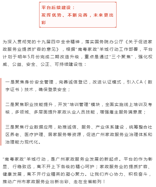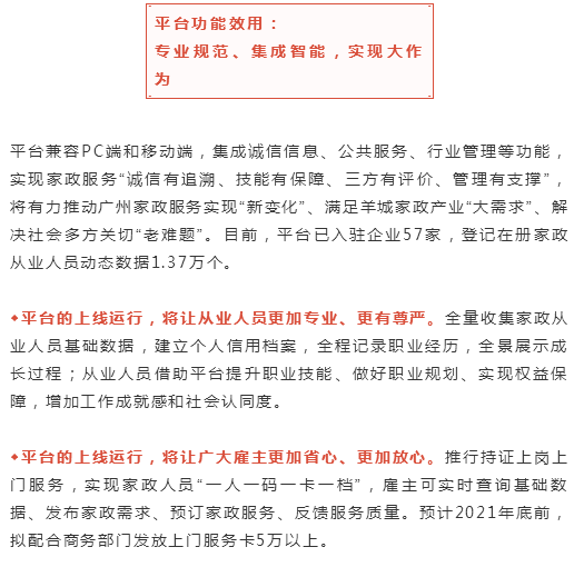 刘梅主席表示:“广州市家政服务综合平台”的诞生,是新时代羊城家政服务业提质扩容的召唤,是市委市政府高度重视家政服务业的成果,是市妇联和市直相关部门集体智慧的结晶。 2017年以来,在市领导关心推动下,在市工信、政数、人社、商务等部门大力支持下,历经三年开发建设,今天,平台正式上线运行,市政府已明确将平台定位为“为广州市民和行业提供管理服务的综合平台”,数据存储于市政府信息化云服务平台,由市妇联直属公益二类事业单位负责运营。 市妇联还将与广州日报就平台端口建设、宣传推广等签署战略合作协议;市直相关部门和羊城晚报还将共同为“羊城十佳满意品牌服务”企业授牌。这些都是推动平台建设、推动广州家政服务业高质量发展的重要力量。